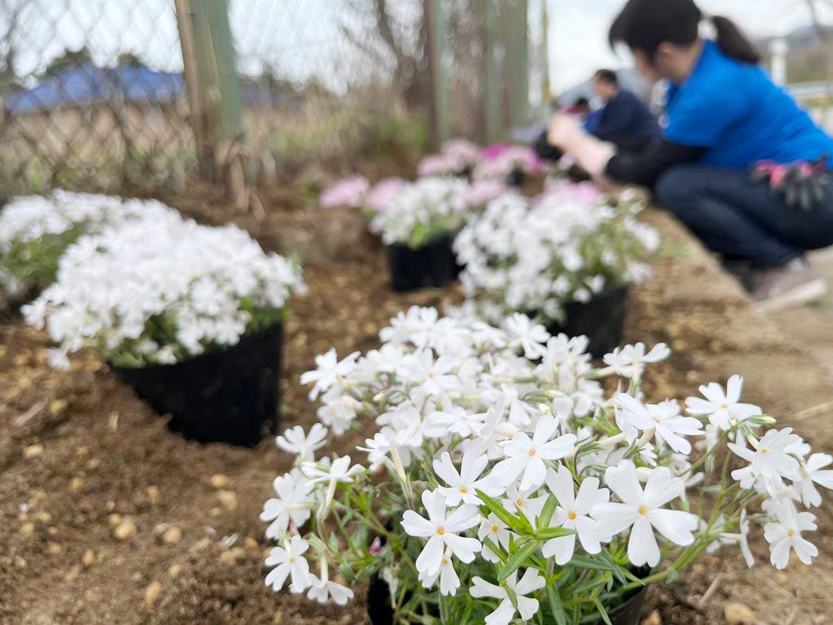 オレモオメモでは無人となって荒れてしまった上海府小学校跡を整備し、少しでも地域を明るく、そして道路沿いを通った人にもルンルン気分で和んでもらいたいと考え、2022年より小学校の道路沿いフェンス下に芝桜を植え、2025年の春に完成させました。